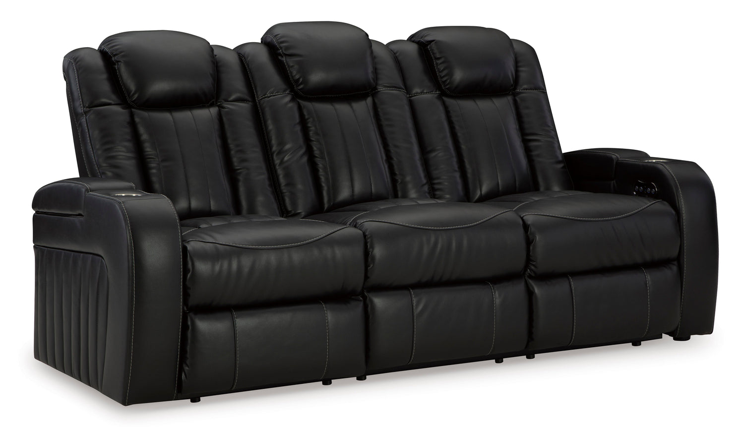 One-touch power control with adjustable positions, Easy View™ adjustable headrest, zero-draw USB port and ambient blue LED lighting;Zero-draw technology only consumes power when the USB receptacle is in use;Wireless and USB charging;Easy View™ adjustable headrest puts your head and neck in optimum position for reading or watching TV even if you're fully reclined;Dual-sided Recliners;Corner-blocked frame with metal reinforced seat;Attached cushions; high-resiliency foam cushions wrapped in thick poly fiber;Faux leather upholstery;Drop-down table with LED reading lights, dual cup holders, 2 electrical outlets; 2 USB charging ports and docking station;Armrests with flip-top storage and cup holder;Power cord included; UL Listed