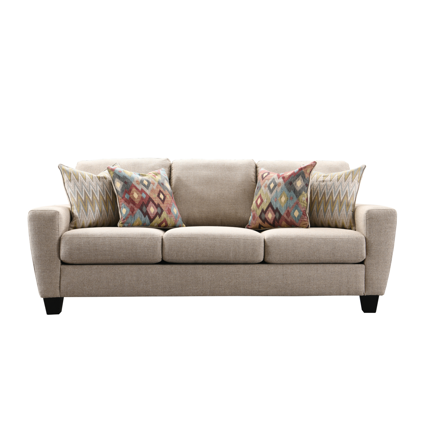 Charming and cozy Hazelnut Sofa by Roots Furniture that ensures comfort and joy. Style up your chic living room with this inviting Beige Hazelnut 3-seater. This geometric sofa brings a much-needed modern energy to any home. The padded sink-right-in cushions and unique patterned pillows are a must-have!