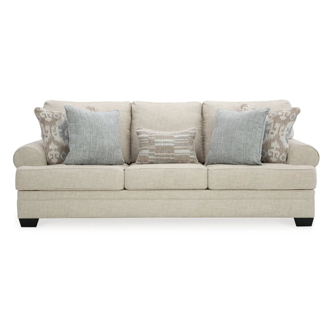 Generously scaled and richly versatile, the Rilynn sofa exemplifies the best in timeless classic style. It's splendidly tailored with transitional roll arms, for a look that's traditional yet far from stuffy. Light, fresh and loaded with multi-textural interest, the sofa's soft chenille upholstery is pure pleasure for the senses. Accent pillows with soothing, neutral tones are a natural fit.