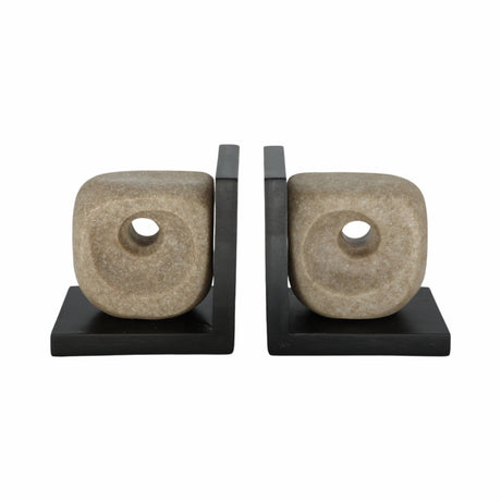 S/2 6" Marble Bookends W/ Travertine Hex Orb, Tan/
