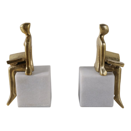 S/2 8" Reading On Marble Stand Bookends, Gold/whit