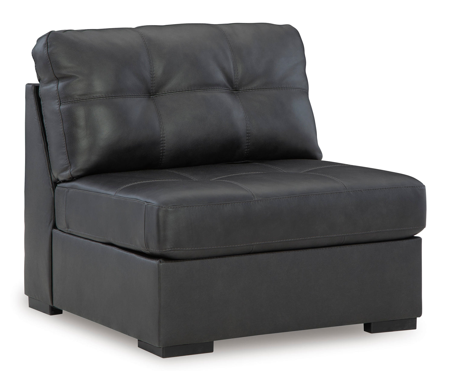 This armless chair is made with leather and faux leather upholstery. Fully finished on all sides, it pairs with other items in the series to make a modular sectional.