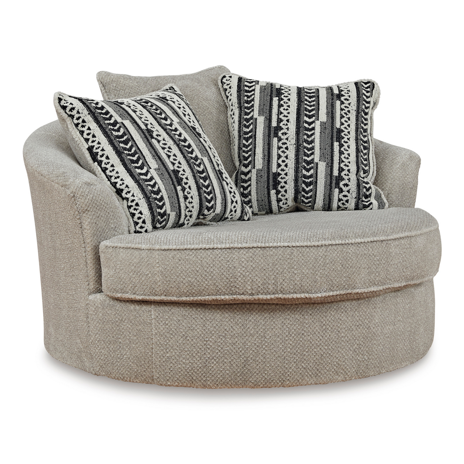 Corner-blocked frame;Attached back and loose seat cushion;High-resiliency foam cushions wrapped in thick poly fiber;Accent pillows included;Pillows with soft polyfill;Polyester upholstery;360-degree swivel;Platform foundation system resists sagging 3x better than spring system after 20,000 testing cycles by providing more even support;Smooth platform foundation maintains tight, wrinkle-free look without dips or sags that can occur over time with sinuous spring foundations
