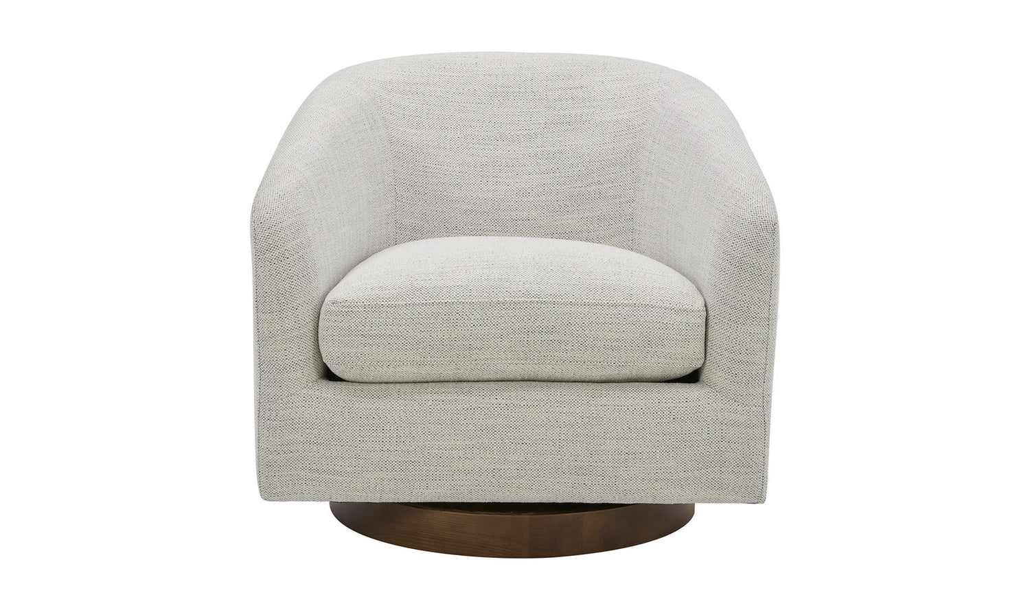 Light and cheerful. Calm and relaxed. The Oscy swivel chair is a cloud of comfort that brings airy energy and convenience into your living room with its 360° swivel, floating base design. Idyllic for a reading nook or as an accent chair, Oscy creates a chic retreat with softly textured fabric upholstery that looks fresh and keeps things cozy.