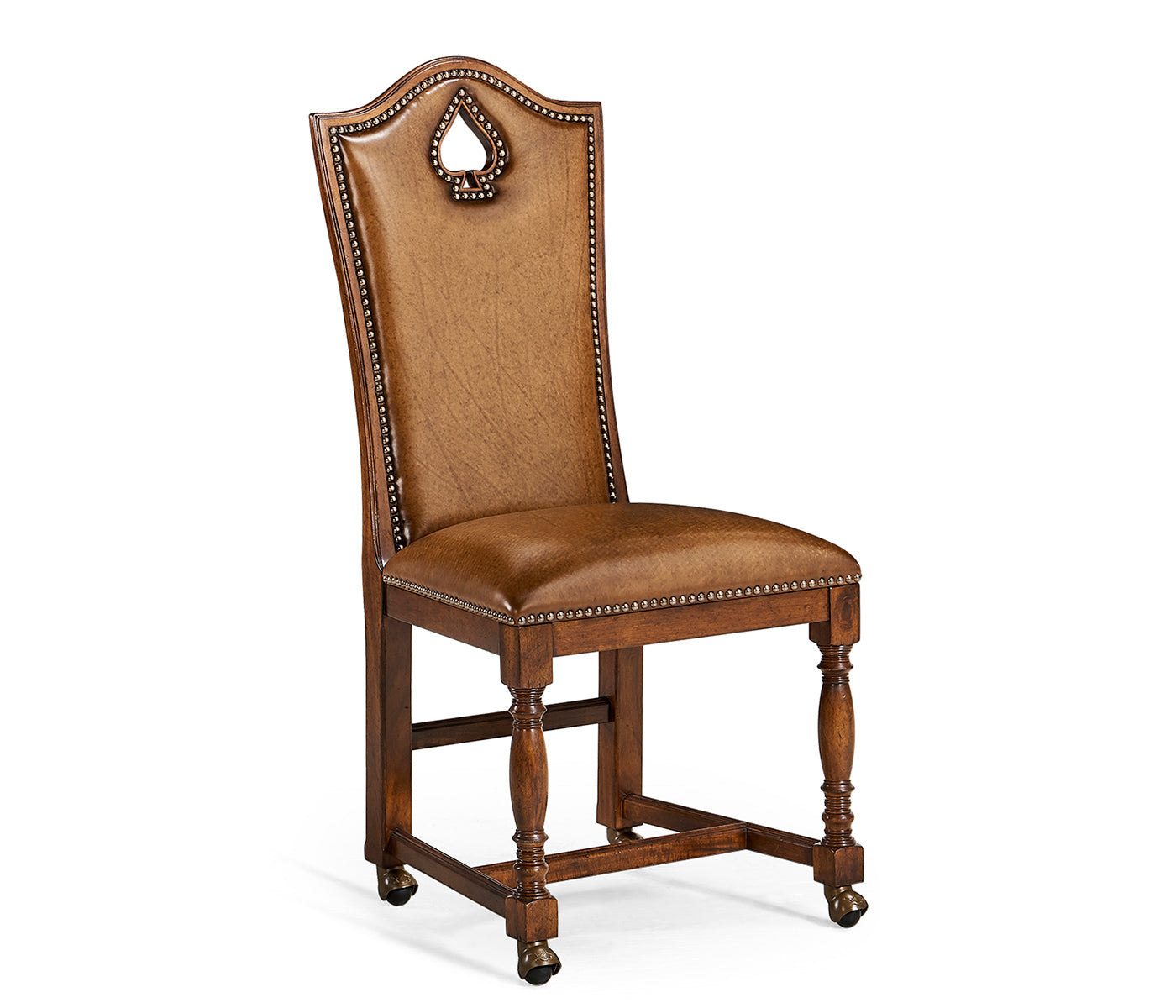 Walnut high backed side chair with medium antique chestnut leather upholstery and a spade shaped handle underneath the curved rail. Heavily carved scrolling arms above baluster turned front legs and an H-shaped stretcher, the whole chair raised on castors. Ideal for poker and bridge. (Old salescode: 493389)