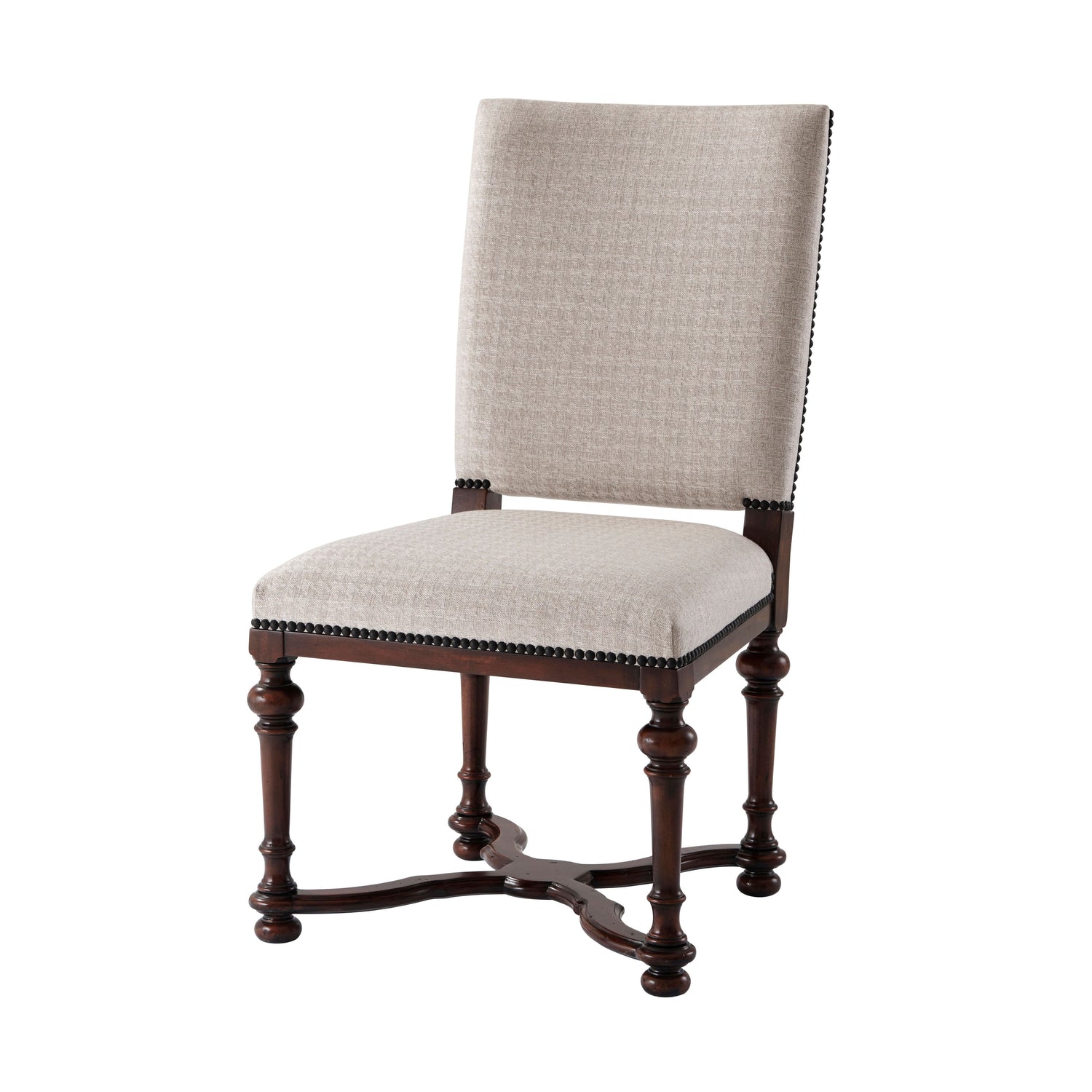 A hand carved side chair, the rectangular padded back and upholstered seat on turned tapering legs joined by a wavy ‘X’ stretcher. The original William and Mary.