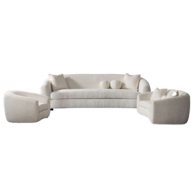 Available in a range of colors including white, gold, black, grey, green, and blue, this sofa is perfect for those looking to add a touch of luxury to their home. The Bouclé Livingroom Set is not only stylish but also incredibly comfortable, with its soft and cozy texture. Curvaceous design is wrapped in a creamy Beige boucle that brings soft texture and dimension to the piece.