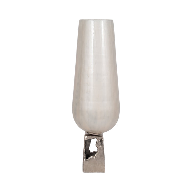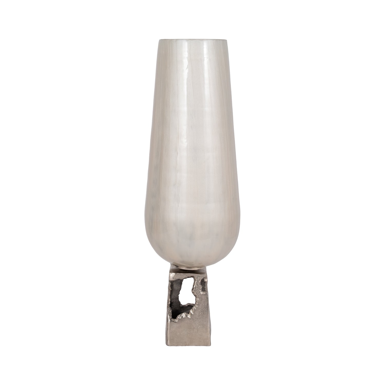 GLASS, 26"H VASE W/ METAL BASE, PERAL WHITE