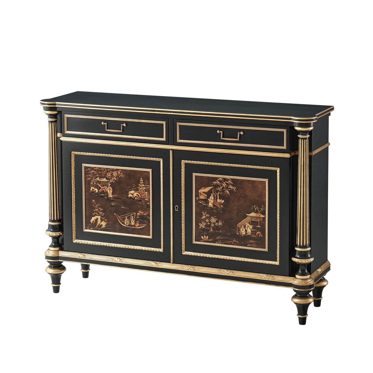An ebonized mahogany and parcel gilt Chinoiserie side cabinet, the rectangular molded edge top with protruding rounded corners, above two brass molding paneled drawers with brass handles, above two brass molding paneled and carved doors with hand-painted Chinosierie scenes, the base with bound reed carved details flanked by turned and fluted columns and on turned and tapering legs.