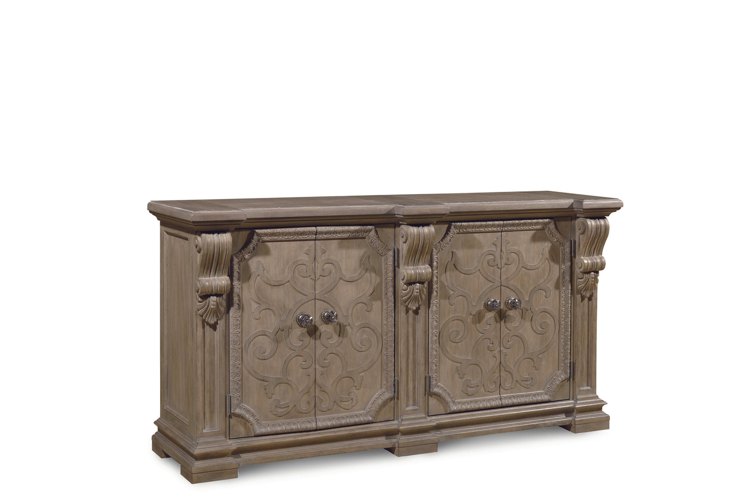 Inspired by the robust neo-classical architecture of the eighteenth century, the doors of the Wren Buffet's two cabinets are overlaid with ornate fretwork, and are framed in lamb?s tongue molding and bold corbeled pilasters. Each cabinet has a drawer and two adjustable and reversible shelves with wine cleats on one side. The buffet is constructed of Parawood solids and cathedral elm veneers, and is available in Parch, a light open-grained finish.