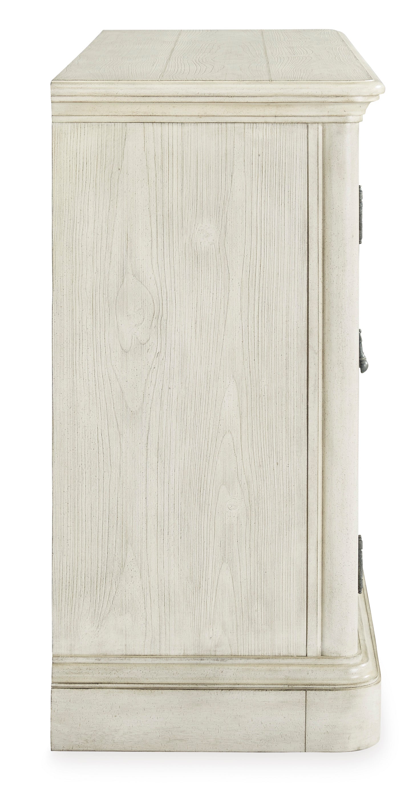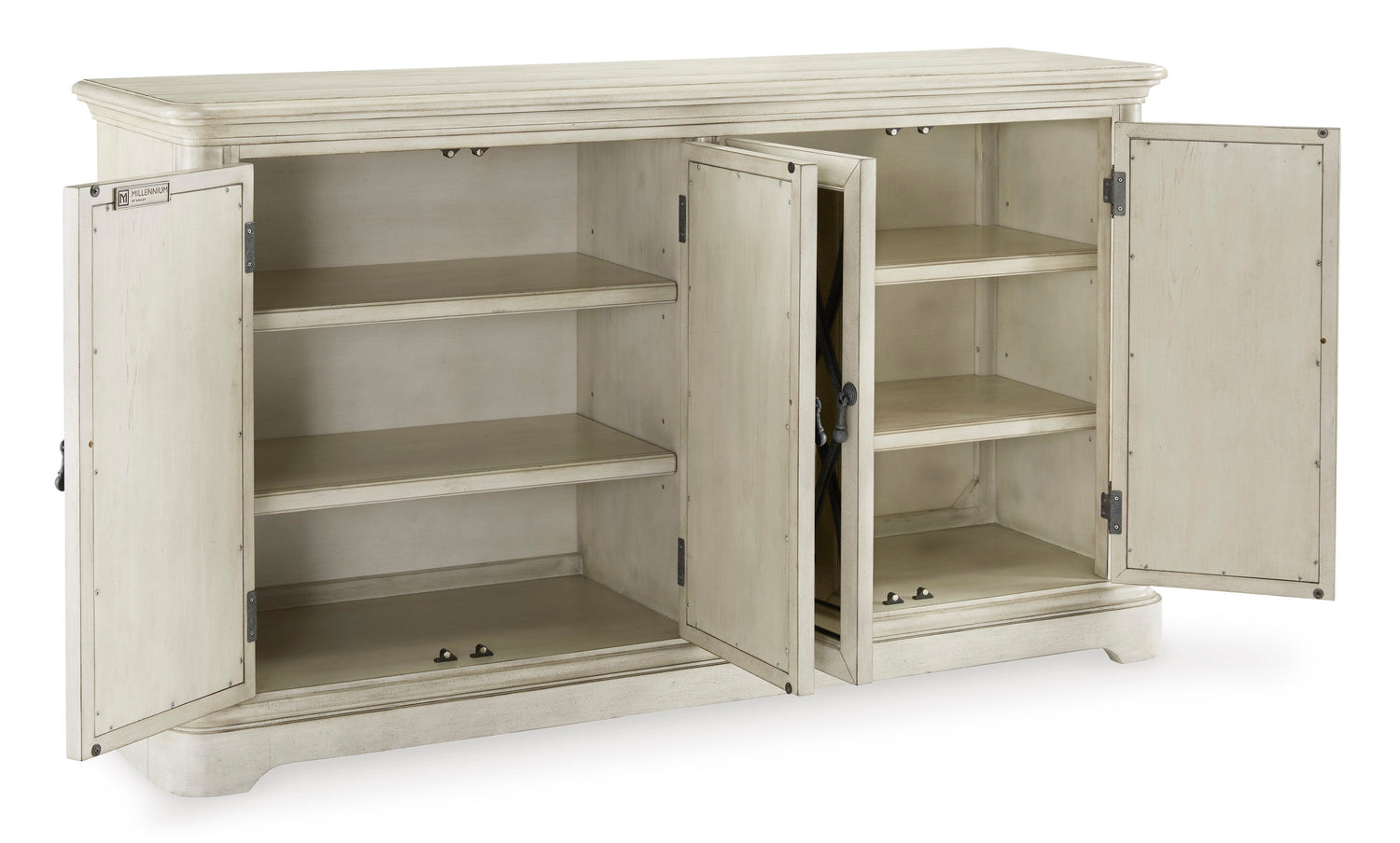 Add a touch of romance to your home with the Arlendyne dining server. Its painted finish and shapely silhouette are all about easy elegance. This wide server turns the spotlight on antiqued mirrored doors with overlay fretwork, concealing plenty of storage while adding a dash of sophistication and upscale luxury.