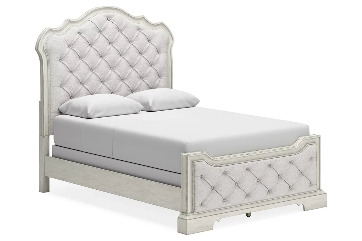 Add a touch of romance to your home with the Arlendyne queen upholstered bed. The antiqued white painted finish and serpentine-shaped silhouette details are the picture of easy elegance. Indulge your love of luxury with decadent button-tufted cushioning from head to toe.