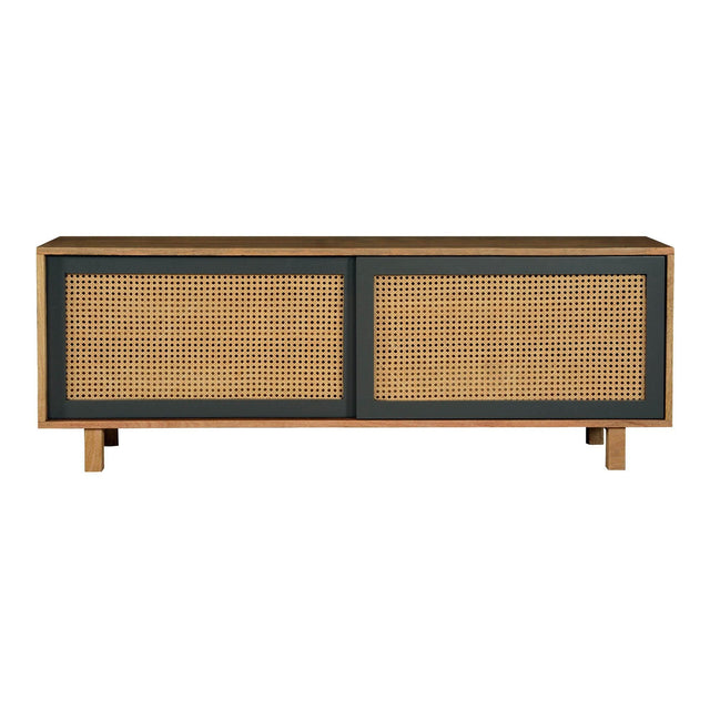A stylish combination of solid mango wood and woven cane give the Ashton Media Console a fresh contemporary style. Two black-framed doors of woven cane slide open to reveal shelving for your home media collection or sound system. The 55" width makes it suitable for a large flat screen TV.