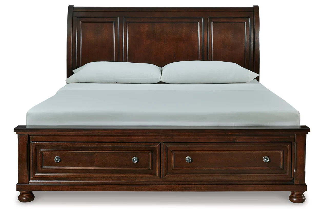The quality craftsmanship is clear to see. The classic design elements—including bun feet—are easy to love. Satisfying your taste for vintage inspiration, the Porter king sleigh storage bed is elegant, without looking fussy. Two built-in drawers at the foot of the bed are great for storing linens and throws. Mattress sold separately.