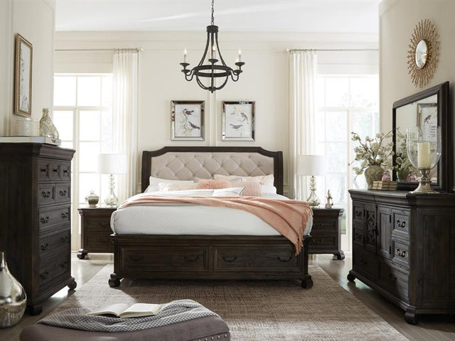 Warm and inviting like an old French friend, Bellamy welcomes with European inspired styling in a unique Peppercorn finish and matte black pewter accented hardware. Scrolling open woodwork adorns the well appointed media chest doors while roomy dressers and chests feature rounded corners atop rounded bun feet. A plethora of bed options offer upholstered tufted headboards, storage footboards, panel headboards and gorgeous shaped panels with or without sumptuous scrolled design work for a Chateau feel for any taste.