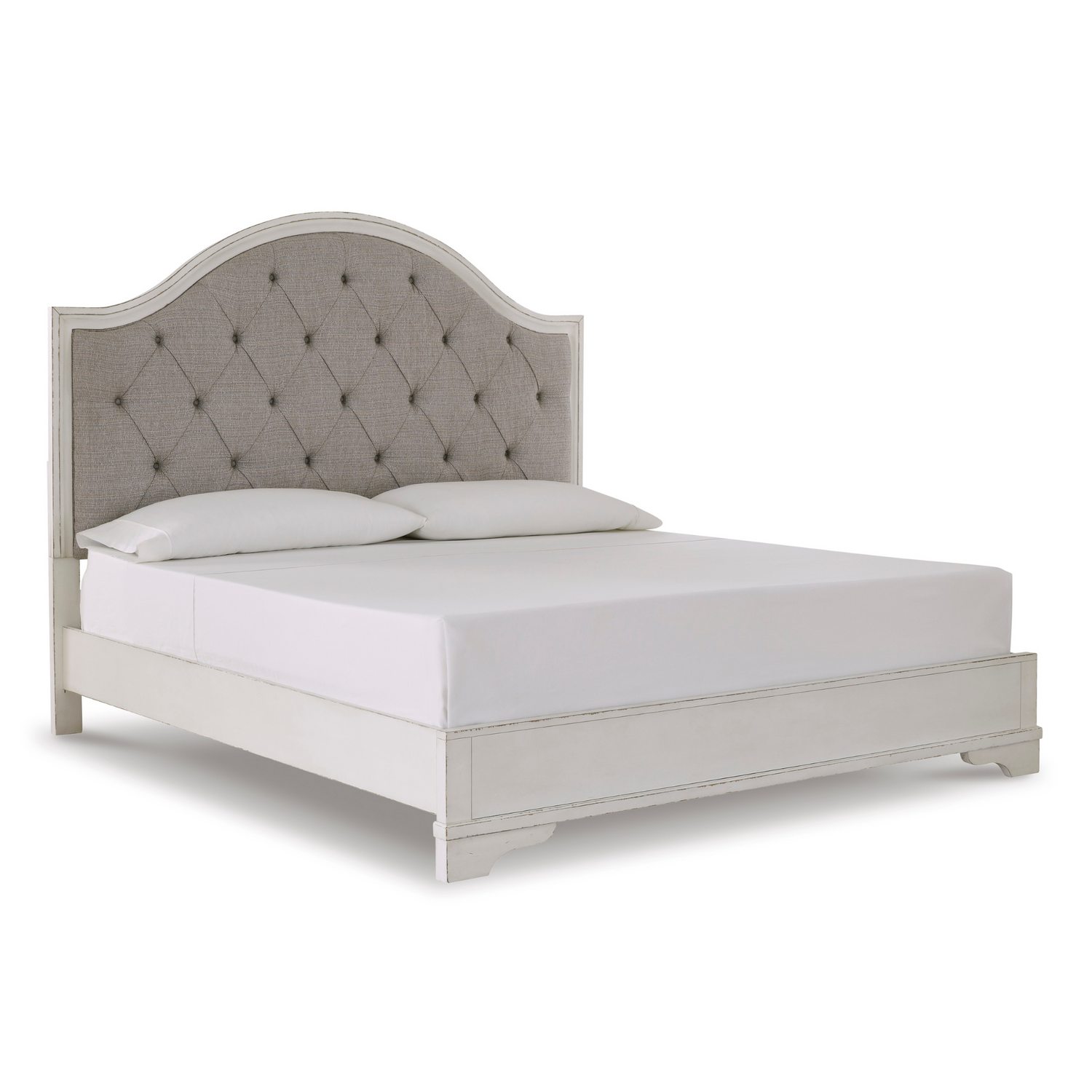 Traditional style doesn’t have to be stuffy. It can feel warm, inviting and beautifully in the moment. Case in point: the Brollyn upholstered king/California king panel headboard. Merging yesteryear elements such as an inset headboard cushion with delightful button tufting, this unique piece has an allure all its own. Equally special is the chipped white finish, which exudes a mood of casual charm and easy elegance.