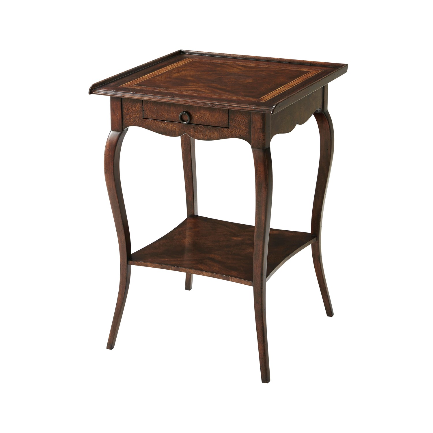 A cerejeira veneered and mahogany end table, the square crossbanded top with a three quarter gallery above an undulating apron fitted with a frieze drawer on cabriole legs joined by a concave sided undertier. Inspired by a 19th century French original.