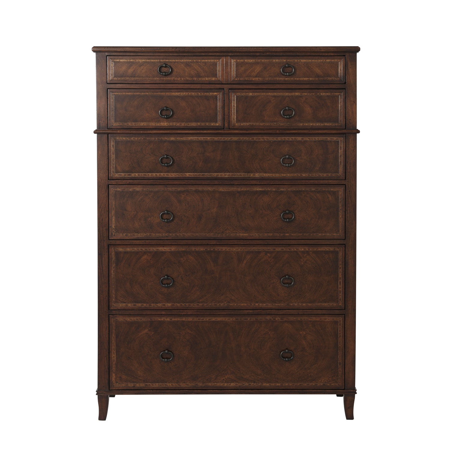A cerejeira veneered and mahogany Gentleman’s chest of drawers, the rectangular top above one long drawer, two short drawers and four graduated long drawers, on splayed legs. The right side with a pull out tie hanger.
