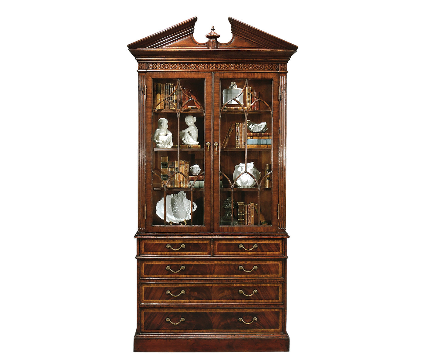 George II style mahogany veneered and cross banded china display cabinet, the top section with a broken pediment centred with an urn, glazed doors with gothic ogee topped glazing bars, three glass inset shelves, and two short and three graduated drawers t