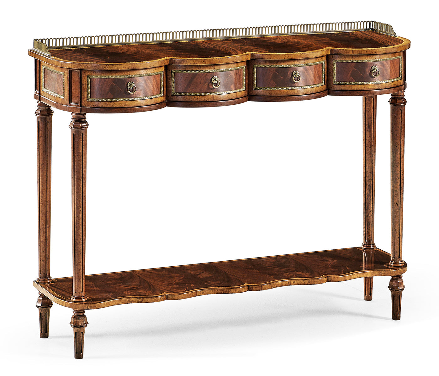 Mahogany scalloped console table with beaded brass and inlaid detail on the drawers and a pierced brass gallery on top. Tapering fluted legs above a mahogany veneered shelf beneath. After a mid-Victorian original of c1850.