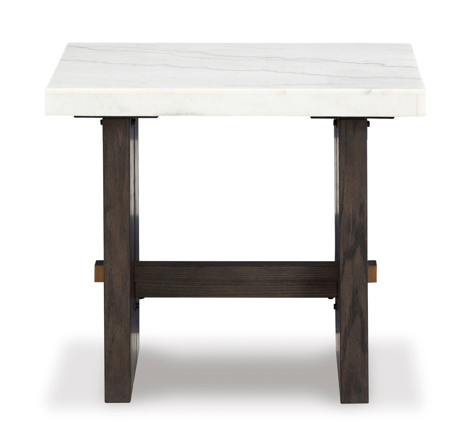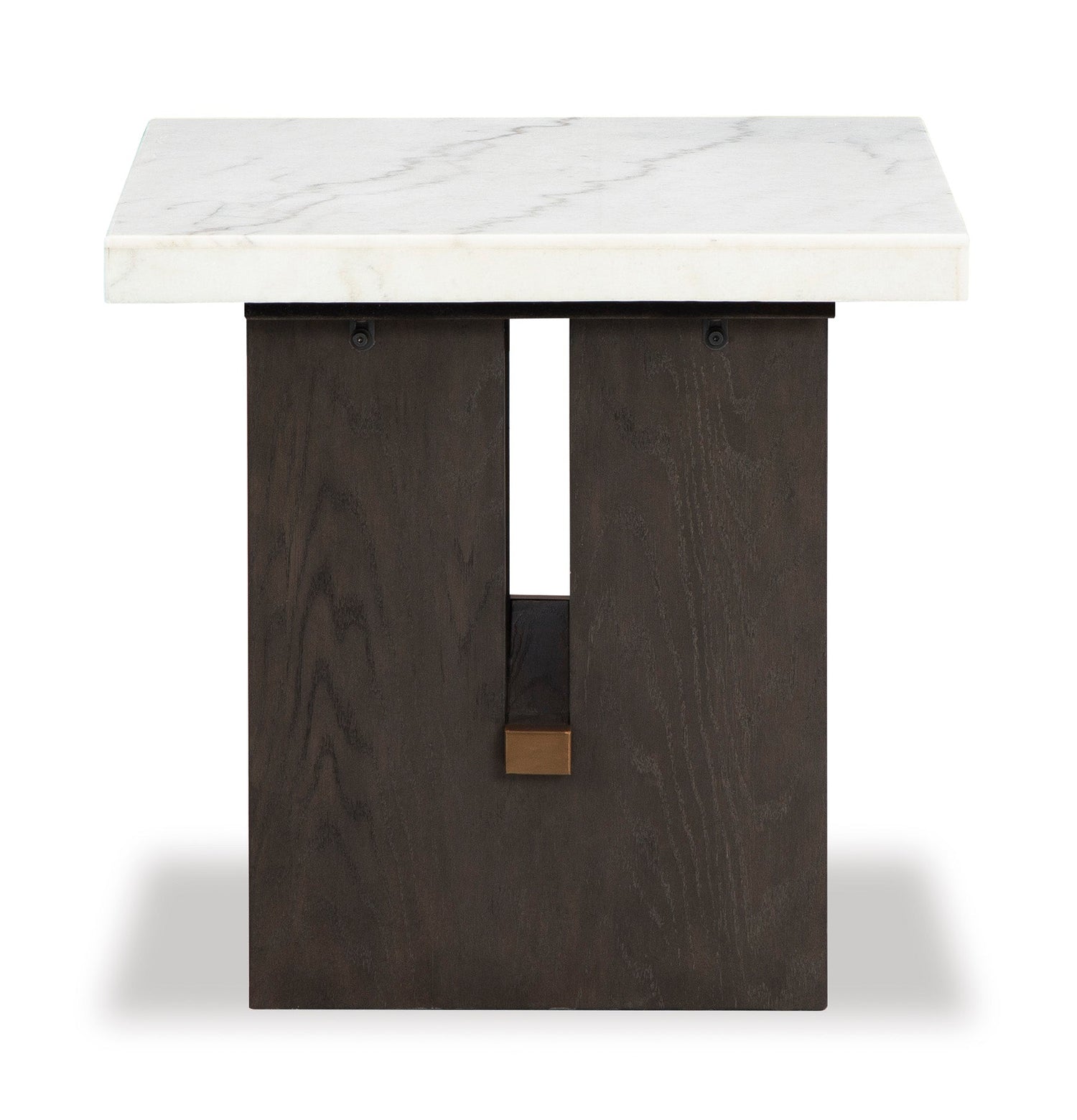 Dressed to thrill, the simply stunning Burkhaus end table offers a high-design look at a down-to-earth price. Ultra-sleek lines are accentuated with a dark waxy brown oak finish that’s so easy on the eyes. Clean-lined and modern, the plinth base and natural marble tabletop showcase quality craftsmanship and attention to detail. This table is the perfect sofa companion for a living room or family space, with a timeless look that's made to last.