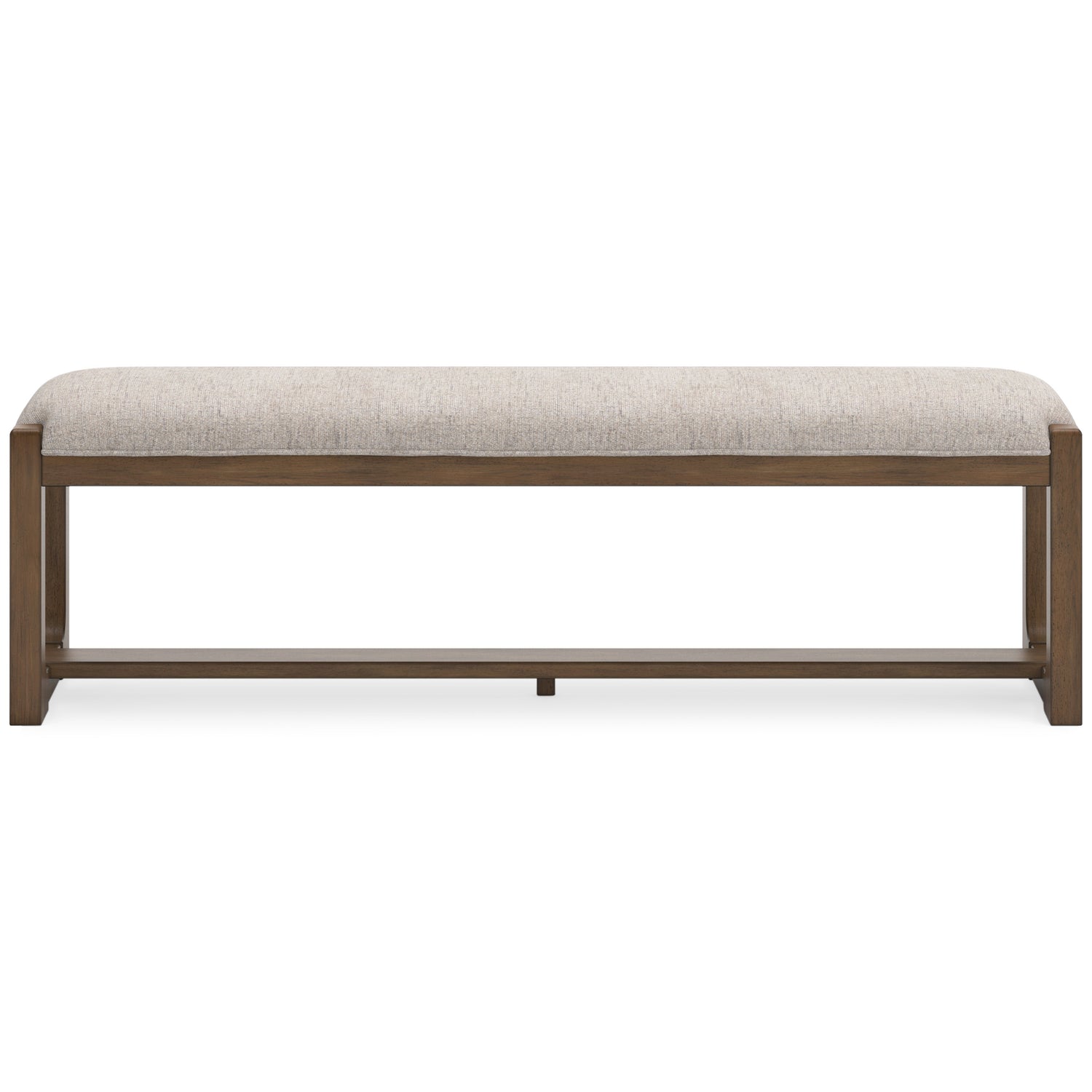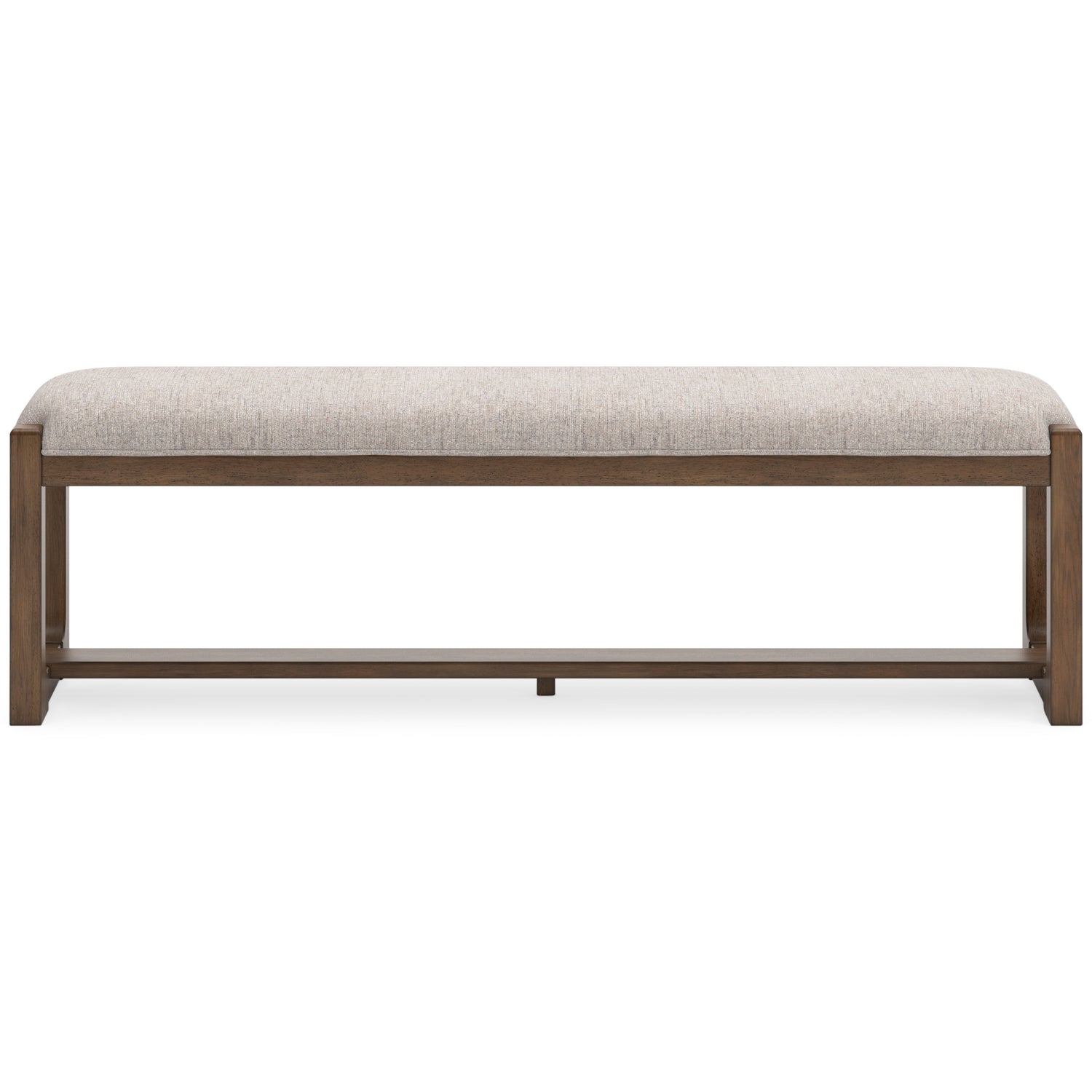 The Cabalynn dining bench sits comfortably at the intersection of modern lodge and farmhouse aesthetics. Your warm and welcoming disposition is reflected in its charming architectural elements and neutral textural fabric. Even with its poise, the bench remains practical. Its cushioned seat invites you to linger longer at the table, defining your dining room with reliable function and style.