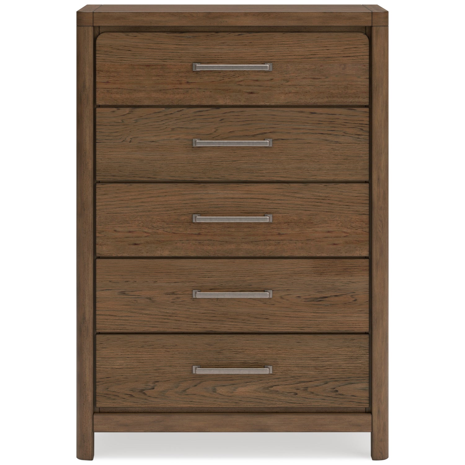 The Cabalynn chest sits comfortably at the intersection of modern lodge and farmhouse aesthetics. Your warm and welcoming disposition is reflected in the charming architectural elements and light brown glazed finish. Even with its poise, the chest remains practical. Smooth-gliding drawers tuck away necessities, defining your bedroom with reliable function and style.