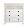 The Calloway Media Chest is a great addition to your home! This chest comes with three spacious drawers, making it easy to store away any belongings neatly. Two media compartments help keep devices properly in place, while the chord control cutout in the back keeps wires out of sight. The drawer fronts feature a raised panel design, adding extra flair to this already stylish piece. The dark metal finish knobs pair beautifully with the white finish. Bevel edges and bracket feet complete the look of this media chest.