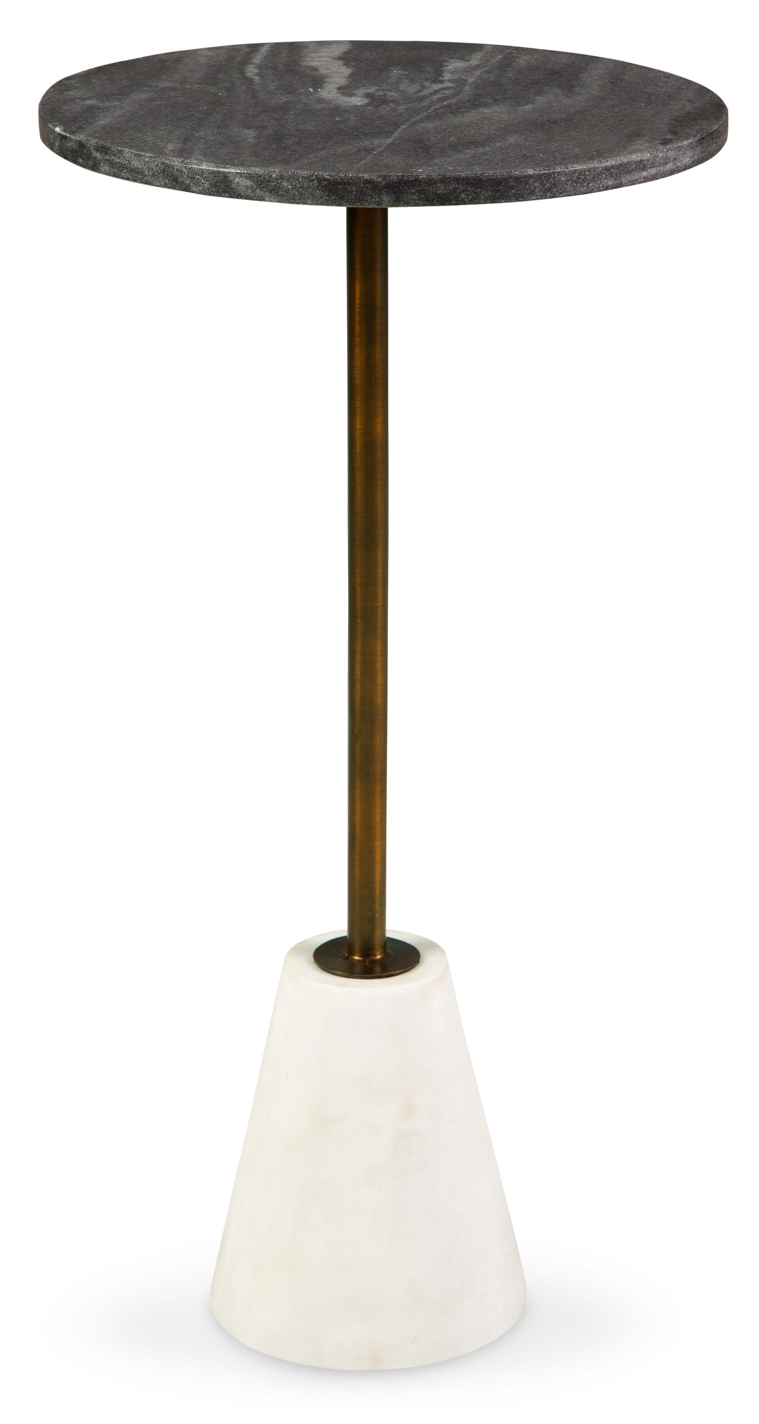 Marvel at the marbled mastery of the high-end Caramont accent table. Made of beautiful black and white marble, the round tabletop is supported by a sturdy goldtone pedestal on a white marble base. With a sleek, tapered profile, this space-saving table is striking from every angle.