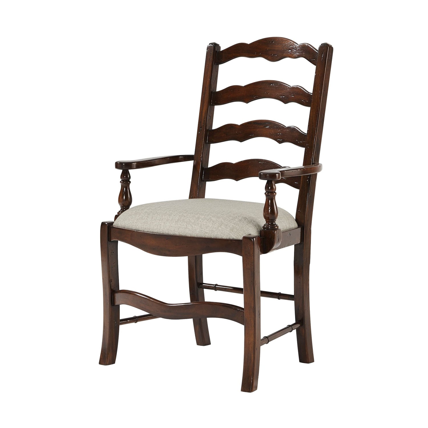 An antiqued wood dining armchair, the arched serpentine ladder back above an upholstered drop in seat, on sabre legs joined by undulating stretchers. The original Regency.