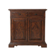 An antiqued wood side cabinet, with two frieze drawers over two parquetry cabinet doors enclosing an adjustable shelf on a moulded base with bracket feet. The original George III.