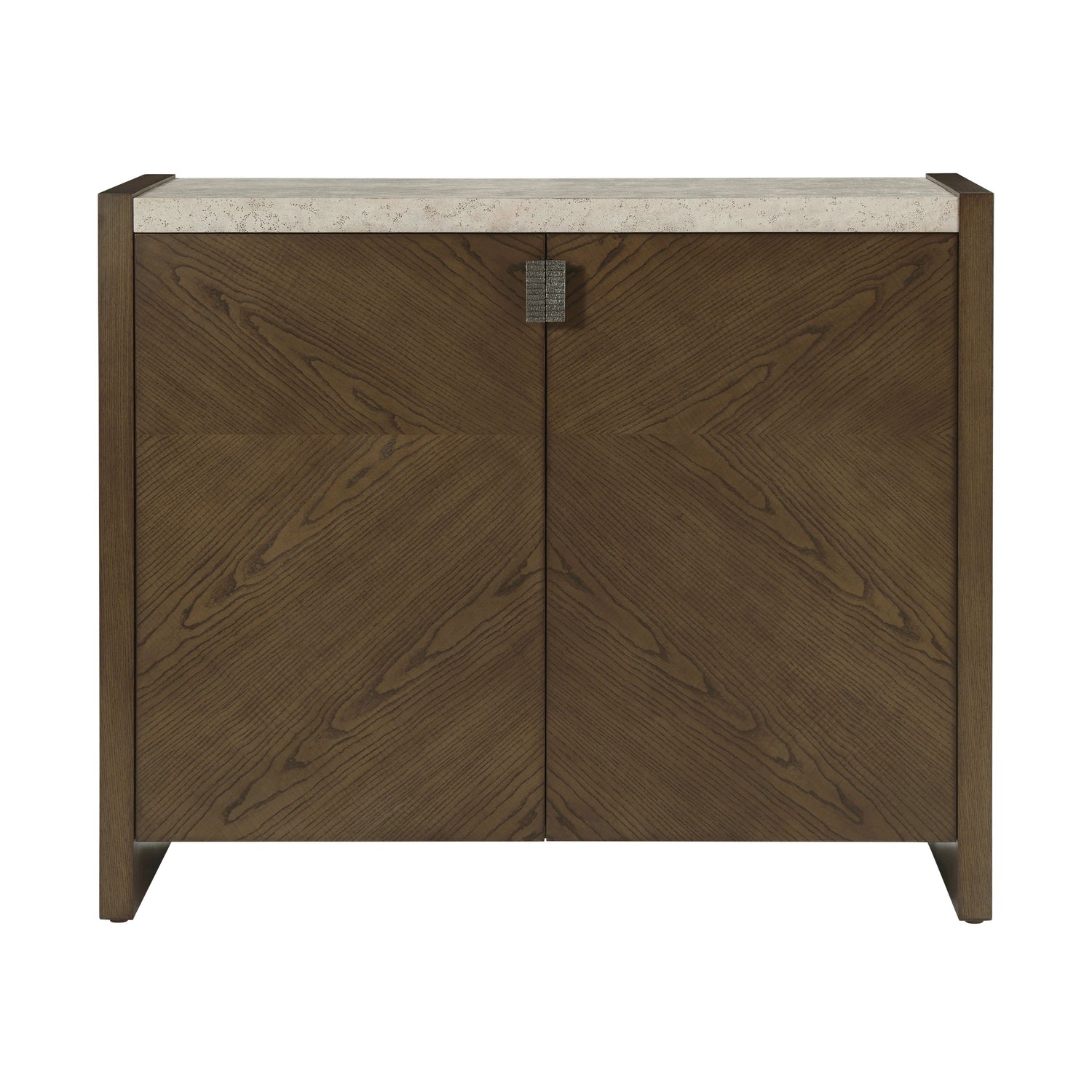 Figured two door hall chest in cathedral ash with peaceful symmetry available in Earth or Dune. Completed with textured metal pulls in our new Ember finish and a stone-like porous top in our exclusive Mineral finish. Includes an adjustable shelf.