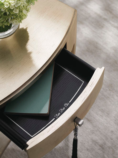 This little accent table is dressed to the nines in our signature Pompeii gold metallic finish – beloved by our interior designer customers for its beautiful blending of silver leaf and a soft wash of metallic gold. It’s like jewelry for your home – a definitive design element for those settings when only ultra glam will do. The petite drawer is accessorized with a black tasseled key. So very, very chic, we think.