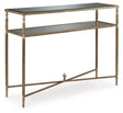 Made with metal and glass;Frame with aged goldtone finish;Inset mirror top;Clear glass shelf;Round legs with bobbins and reeded embellishments;Lower stretcher with decorative center finial;Assembly required,Sofa Table