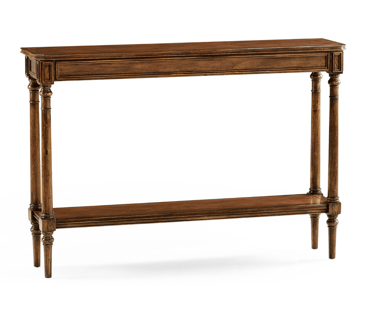Restrained design narrow console table in distressed walnut, the canted rectangular top set between tapering baluster legs and an undertier beneath. (Old salescode: 494601)