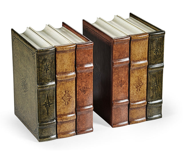 A pair of victorian inspired faux bookends, the three books with different coloured leather bindings and tooled details. Handpainted antiqued faux pages to the top and bottom.