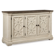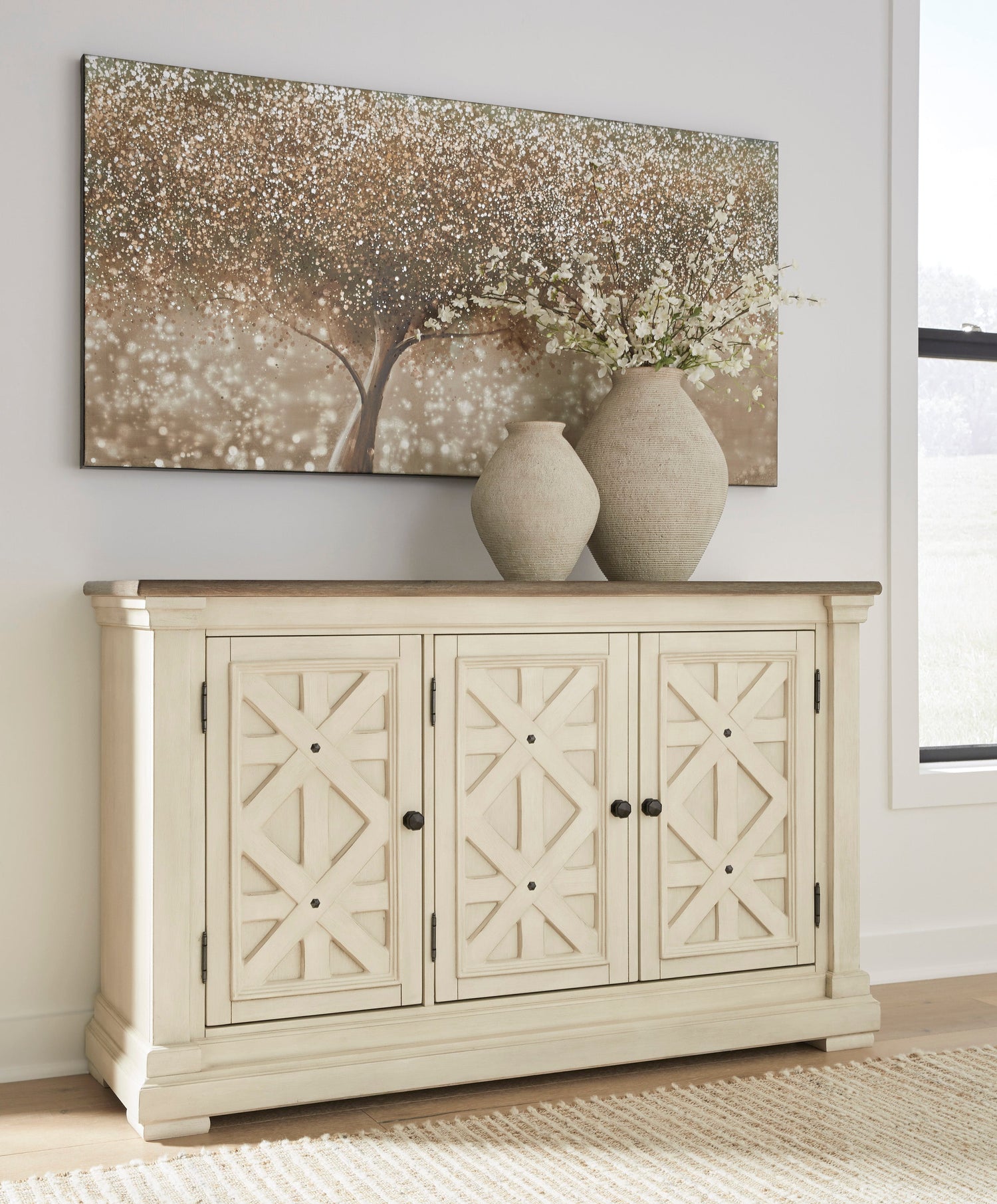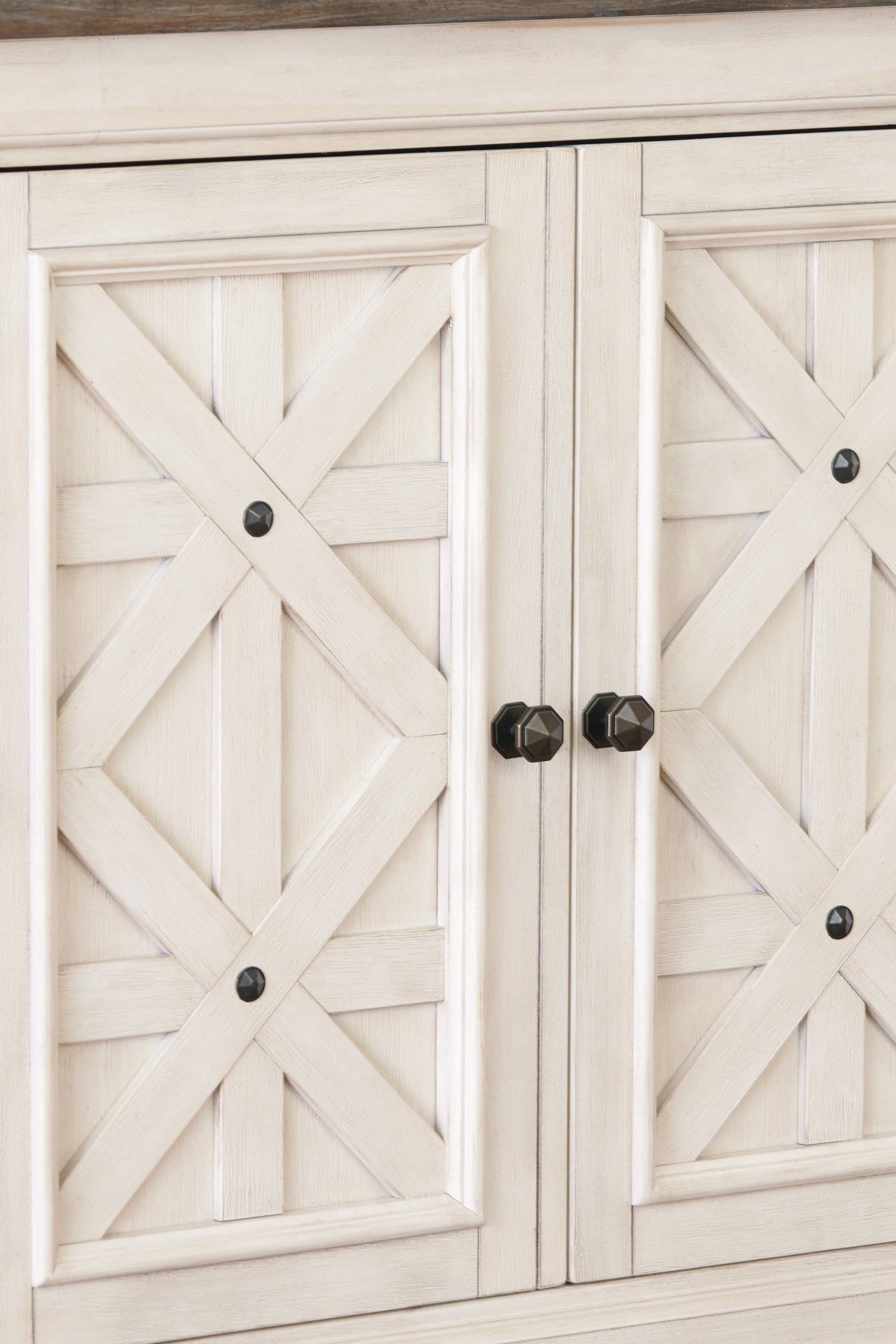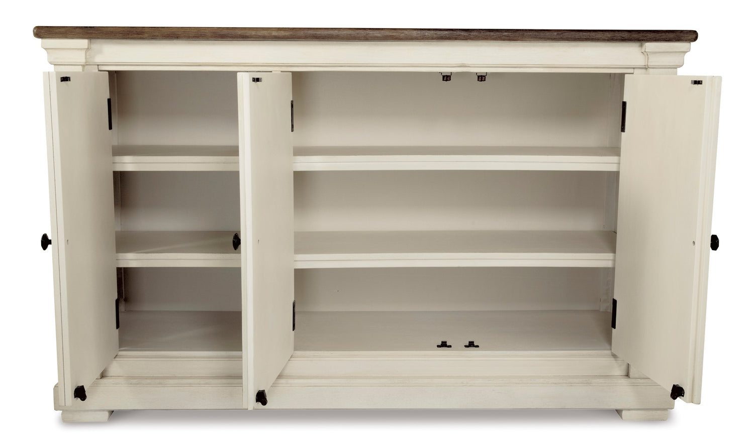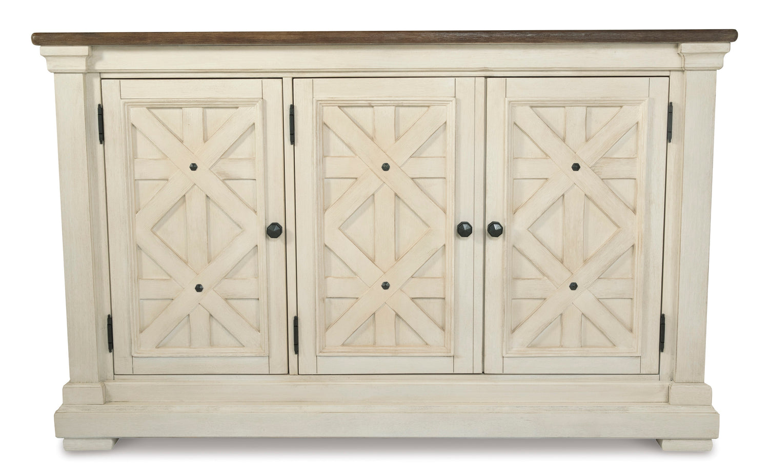 Need a stylish space to store dinnerware and all your dining room essentials? The Bolanburg server is a dream come true with four adjustable shelves that offer large capacity and a spacious top that's perfect for setting a buffet. Embellished with the casual appeal of three latticed doors, an attractive planked top with weathered oak finish and a lightly distressed white finish throughout, this vintage look will serve up elegance for years to come.