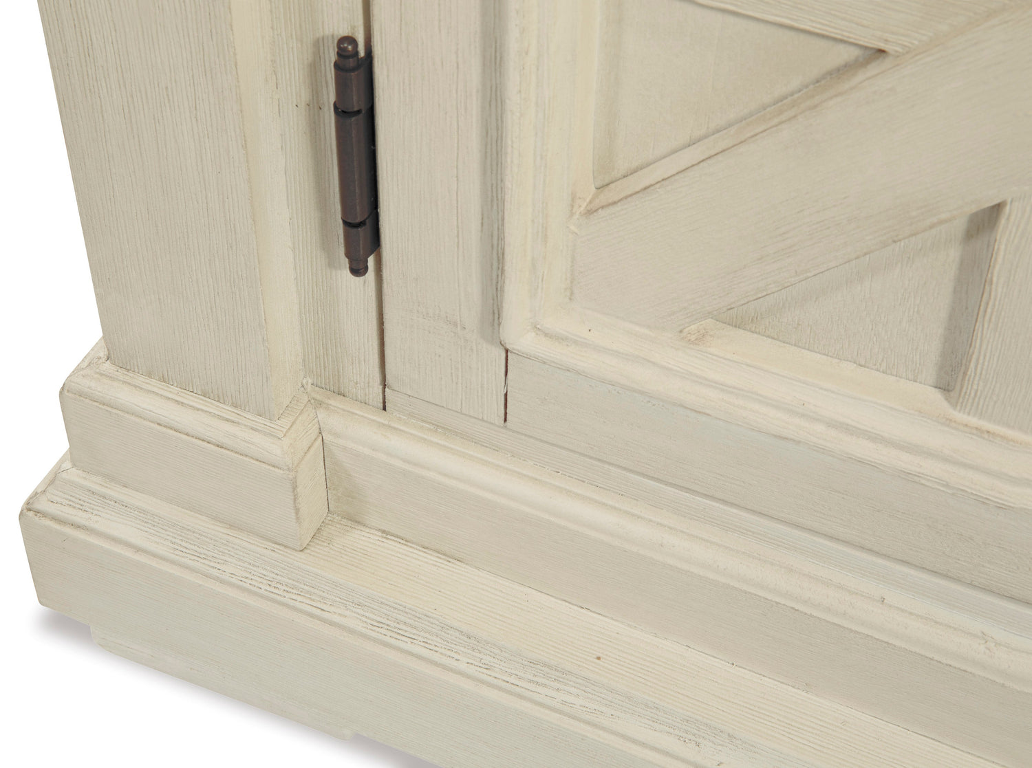 Made of veneers, wood and engineered wood;Two-tone textural finish; weathered oak finished top and antiqued white finish throughout;3 doors;2 adjustable shelves;Assembly required;Expert assembly recommended; available at check out for an additional fee;Excluded from promotional discounts and coupons