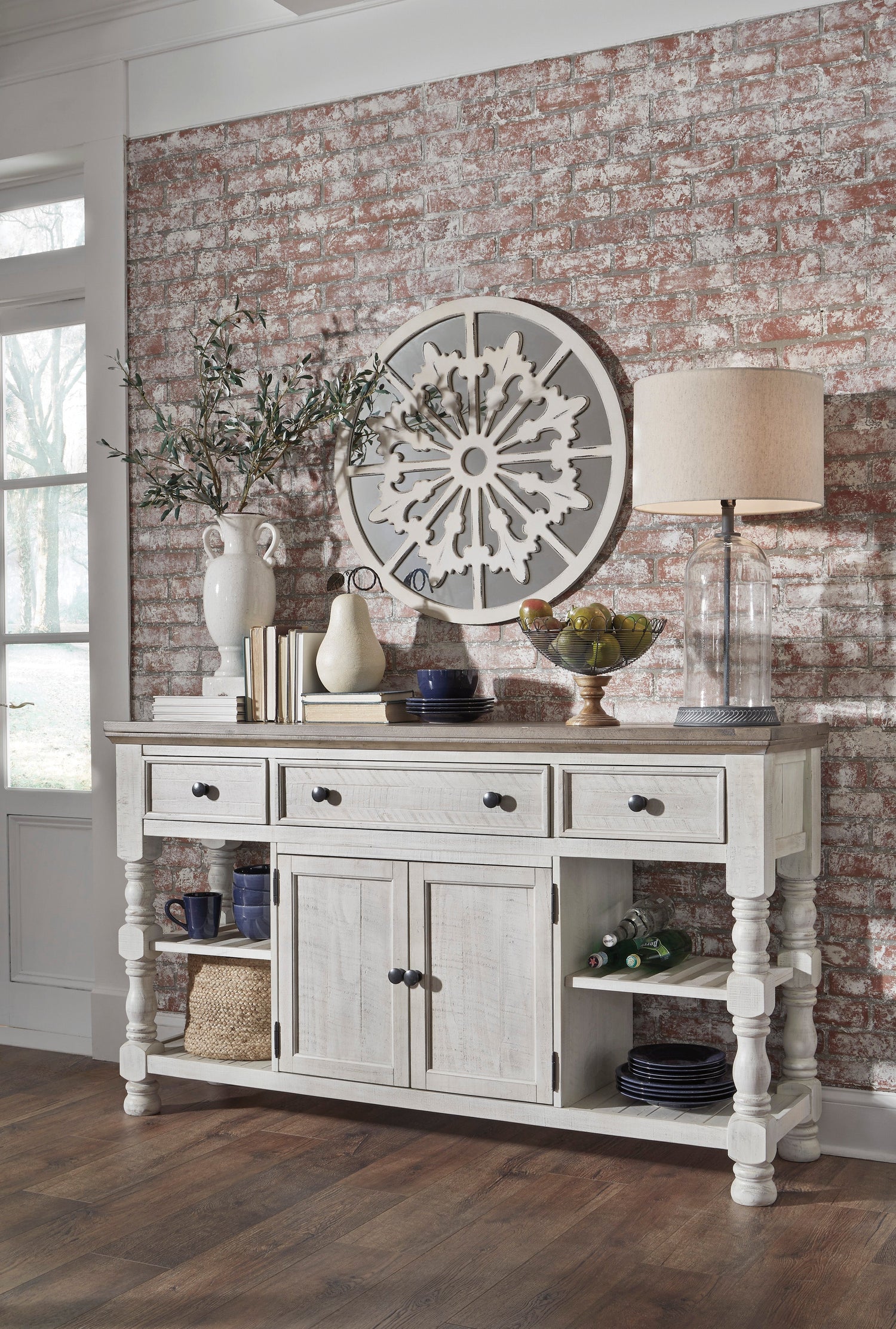 Have your fill of modern farmhouse style with the Havalance dining room server. Distressed two-tone treatment blends a weathered gray with vintage white for an utterly charming effect. Robust posts and thick mouldings lend a hearty, substantial look that feels right at home. Along with drawer and cabinet storage, reversible wine rack/shelves add to its toast-worthy appeal.