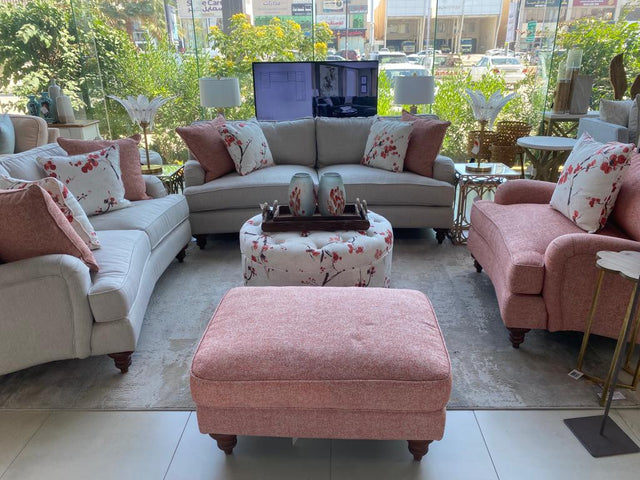 Contemporary styling sofa set outlined by stainless accent strips and white platinum toned upholstery.