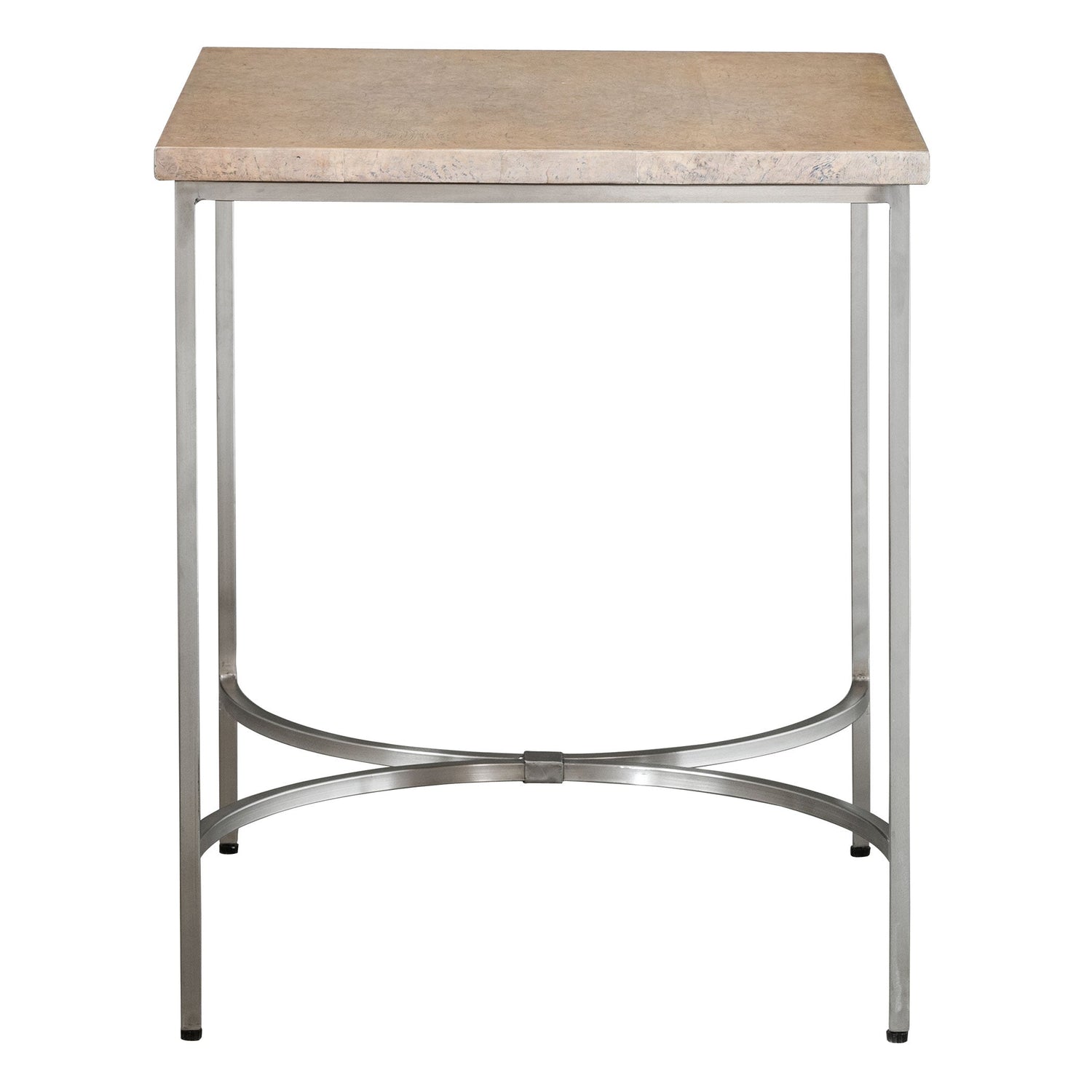 With Casual Contemporary Styling, This Side Table Features A Naturally Finished Oak Burl Veneer Top, Paired With A Hand Forged Stainless Steel Base Finished In Brushed Nickel.
