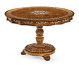 Fine round burl oak veneered centre table with serpentine apron, acanthus carved stem and palmette detail to base, and fine mother of pearl inlay throughout. After an original of c.1850. (Old salescode: 499329)