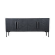 Clean lines with sleek sophistication, this credenza sidelines a timeless design for continuous style and function. Full-sized, the Fishbone sideboard is made from reclaimed mango wood with a herringbone pattern shaped into its warm, darkened up design. Mounted on a sturdy pewter finished iron frame, its 4 cabinet doors swing open to reveal welcoming storage compartments for your dining ware, bar supplies, whatever you need to be stored safely away.