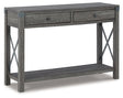 Open the door to modern farmhouse style with the Freedan console table. The beautiful woodgrain look and classic crossbuck metal accents are a cool touch, while the lower shelf provides surface space for fashionable home accessories. A pair of smooth-gliding drawers is the answer to the daily, where-are-my-keys question.