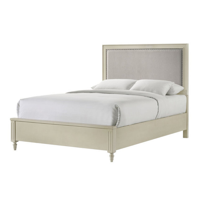 The Gianna Bed brings cottage charm to a traditional look. This bed is crafted of solid and manufactured woods in an off-white finish. The panel headboard showcases light grey upholstery with nail head trim. Complete your bedroom with the Gianna bed for a country style with a modern twist. Full assembly is required and box spring.