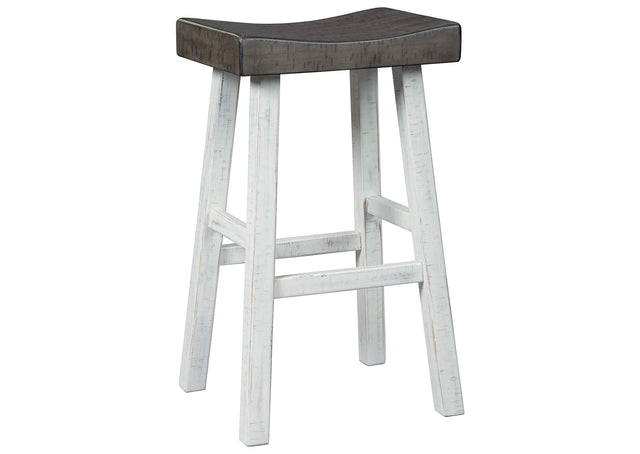 Made of wood;Two-tone finish (antiqued white base and medium brown wood tone seat);Saw kerf distressing;Comfortable footrest;Pub height;Assembly required