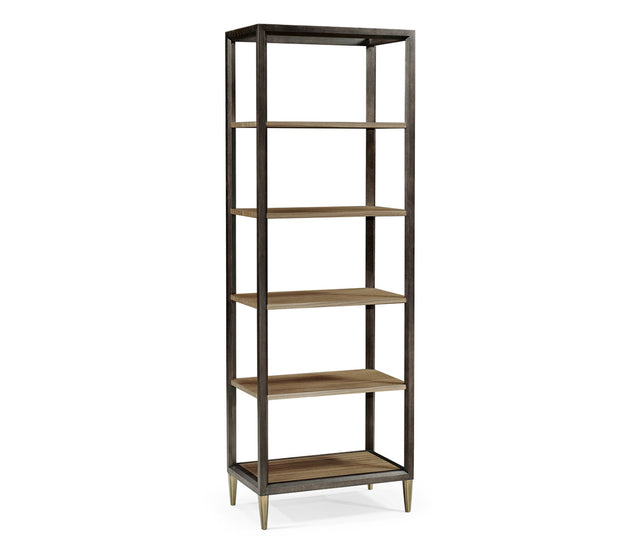 Built from hardwood solids with beveled, ebonized, posts and rails. Shelves feature flat cut paldao with light transparent lacquer finish. Feet are brass which is acid dipped and hand rubbed to achieve a rich, natural patina.