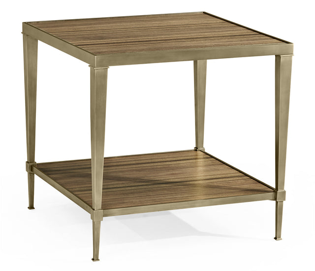 Informed by the symmetry and balance of classic forms, this table features quartered paldao veneer under a light, transparent lacquer finish. Frame is acid dipped, hand rubbed brass with a rich, natural patina.