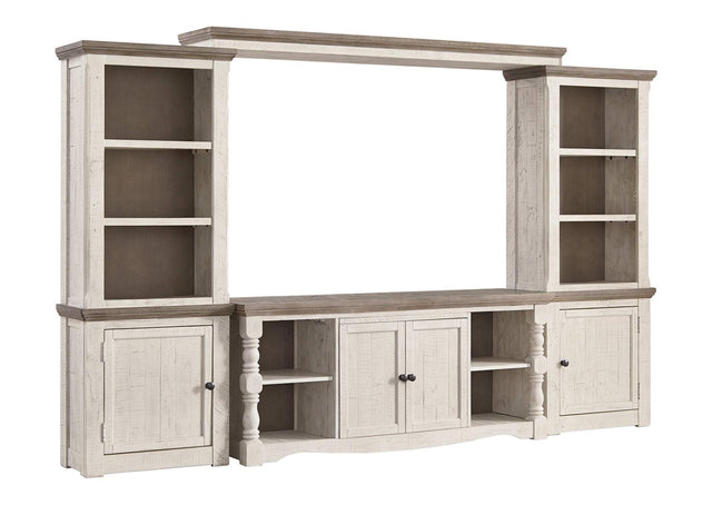 Set your sights on modern farmhouse style with this entertainment center. Distressed two-tone treatment blends a weathered gray with vintage white for an utterly charming effect. Turned posts lend a hearty, substantial look that feels right at home, while plenty of open shelving makes the aesthetic anything but heavy.