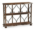 Two-tier étagère in Rustic Walnut with a heavy distressed finish and intricate wrought iron detailing.